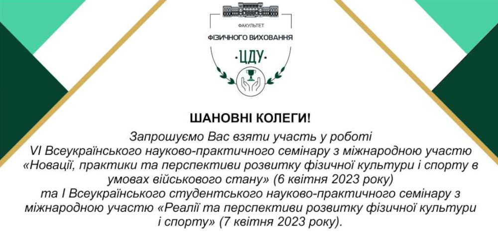 Запрошуємо колег та студентів долучитися до роботи VІ Всеукраїнського науково-практичного семінару з міжнародною участю «Новації, практики та перспективи розвитку фізичної культури і спорту в умовах воєнного стану» (6 квітня 2023 року) та І Всеукраїнського студентського науково-практичного семінару з міжнародною участю «Реалії та перспективи розвитку фізичної культури і спорту» (7 квітня 2023 року).
