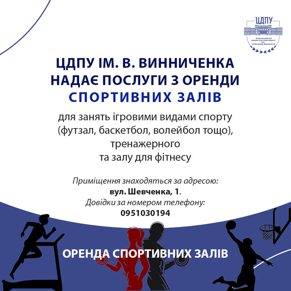ЦДПУ ім. В. Винниченка надає послуги з оренди спортивних залів для занять ігровими видами спорту (футзал, баскетбол, волейбол тощо), тренажерного та залу для фітнесу.