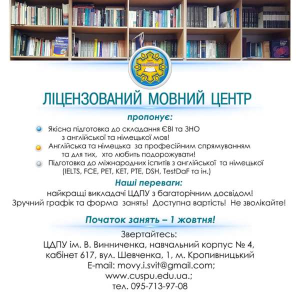 Ліцензований Мовний Центр, що був створений на базі Факультету Іноземних мов ЦДПУ ім..В.Винниченка запрошує всіх бажаючих завітати до нас та обрати програму навчання.