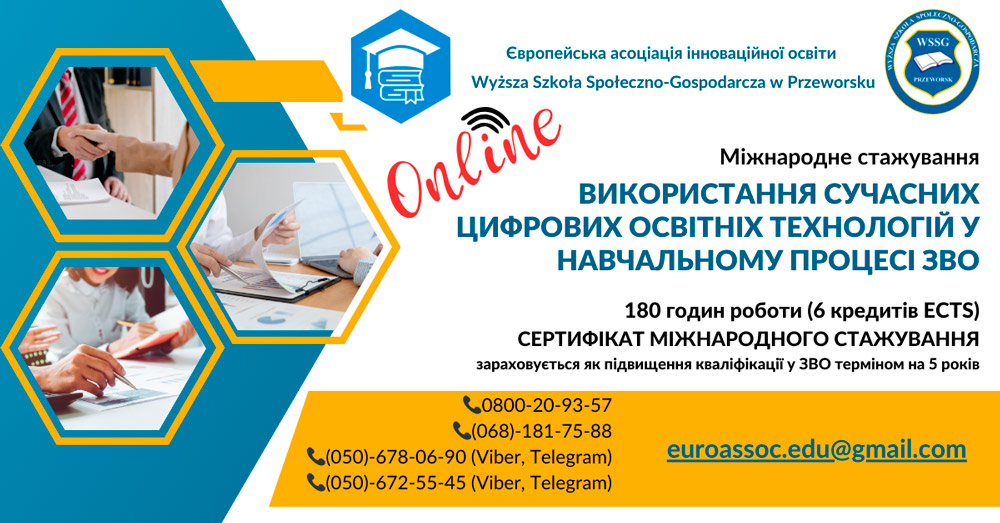 Європейська асоціація інноваційної освіти "Wyższa Szkoła Społeczno-Gospodarcza w Przeworsku" запрошує науково-педагогічних працівників взяти участь у міжнародному стажуванні на тему: «Використання сучасних цифрових освітніх технологій у навчальному процесі ЗВО» і отримати сертифікат міжнародного стажування.