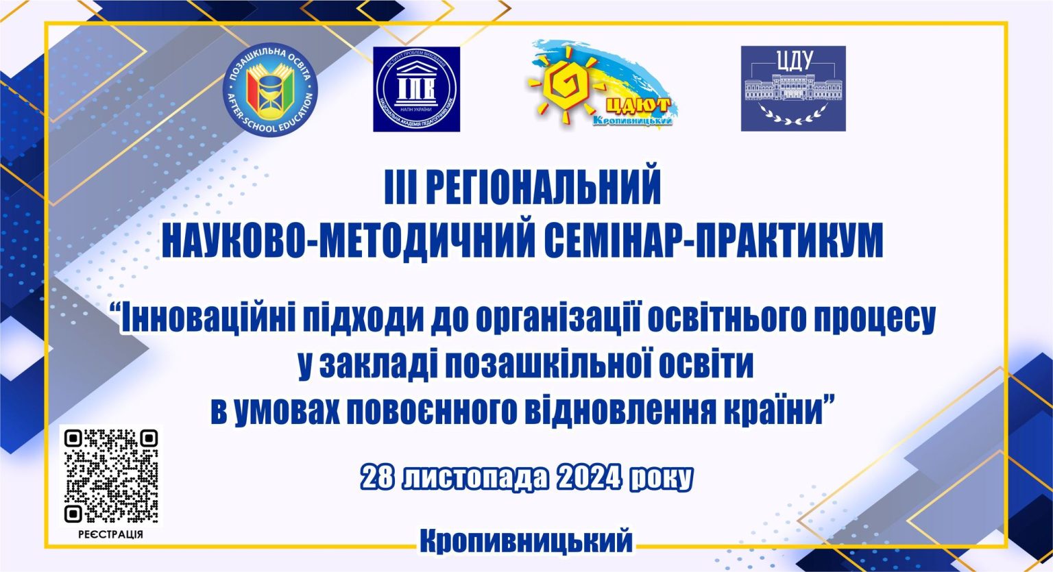 Кафедра педагогіки та спеціальної освіти ЦДУ ім.В.Винниченка запрошує до участі в засіданні постійно діючого Регіонального науково-методичного семінару-практикуму «Інноваційні підходи до організації освітнього процесу у закладі позашкільної освіти в умовах повоєнного відновлення країни», який відбудеться 28 листопада 2024 року в онлайн форматі.