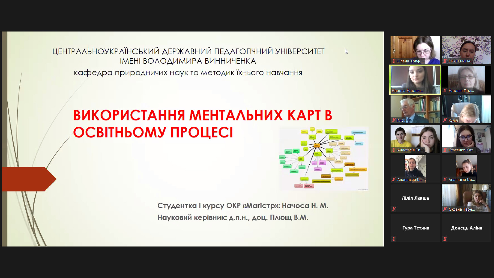 - ВИКОРИСТАННЯ МЕНТАЛЬНИХ-КАРТ В ОСВІТНЬОМУ ПРОЦЕСІ Начоса Н.М. 1, Плющ В.М. 2 – 1 студентка-магістрантка; 2 доктор педагогічних наук, доцент кафедри природничих наук та методик їхнього навчання, в.о. декана природничогеографічного факультету Центральноукраїнського державного педагогічного університету імені Володимира Винниченка.