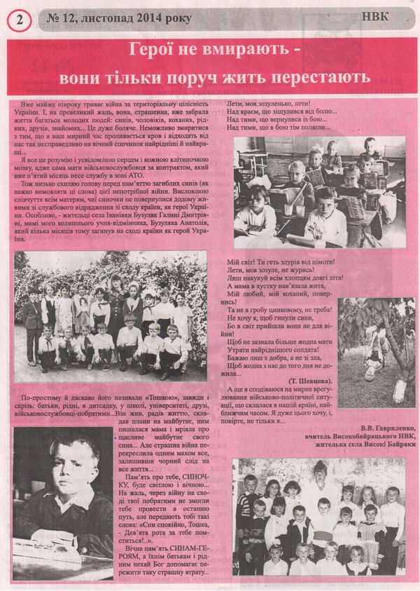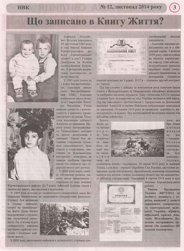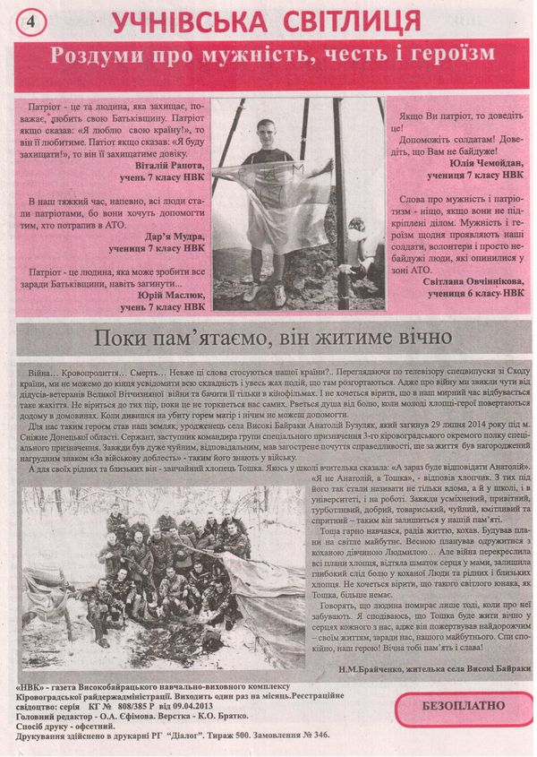 Напередодні відкриття меморіальної дошки, присвяченої Анатолію Бузуляку – Герою України, який загинув, захищаючи її незалежність, Високобайрацький НВК Кіровоградської райдержадміністрації випустив тематичну газету.