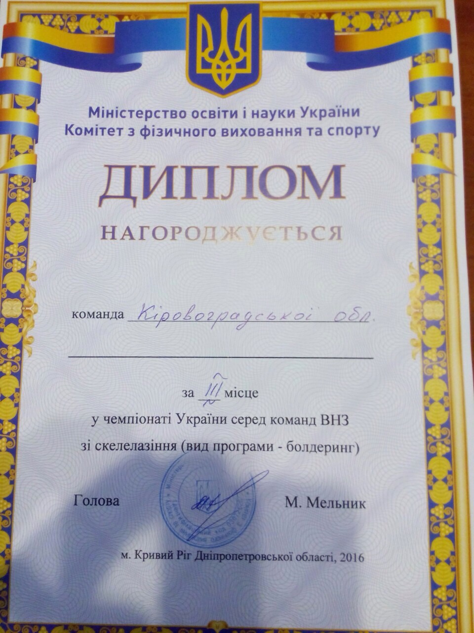 19 – 21 лютого в м. Кривий Ріг відбувся Чемпіонат України зі скелелазіння серед студентів вищих навчальних закладів (вид програми – болдеринг). На змагання приїхали 70 найсильніших спортсменів із шести областей України – Дніпропетровської, Харківської, Полтавської, Кіровоградської, Київської, Вінницької та м. Київ. Усі вони представляли 14 ВНЗ України.