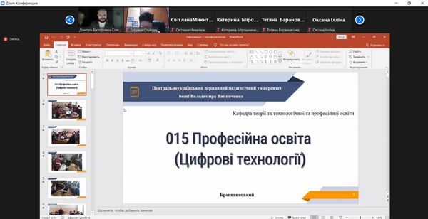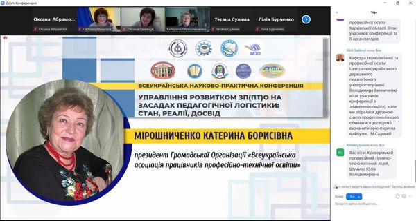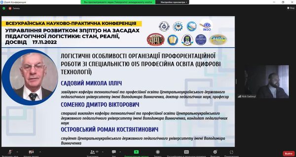 Завдяки давнім творчим взаємозв’язкам кафедри технологічної та професійної освіти Центральноукраїнського державного університету імені Володимира Винниченка з кафедрою професійної і вищої освіти Центрального інституту післядипломної освіти Державного закладу вищої освіти «Університет менеджменту освіти» НАПН України (Меморандум про взаєморозуміння та взаємодію у фундаментальних та прикладних наукових дослідженнях) наш університет став співорганізатором Всеукраїнської науково-практичної конференції «Управління розвитком ЗП(ПТ)О на засадах педагогічної логістики: стан, реалії, досвід», яка відбулася у онлайн форматі 17 листопада 2022 р. на базі Державного закладу вищої освіти «Університет менеджменту освіти» Національної академії педагогічних наук України, м. Київ (наказ МОН України від 21.05.2019 р. № 693).