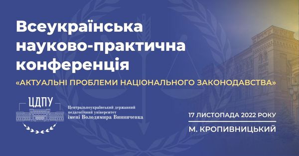 17 листопада 2022 року на базі факультету історії, бізнес-освіти та права Центральноукраїнського державного педагогічного університету імені Володимира Винниченка відбулася Всеукраїнська науково-практична конференція «Актуальні проблеми національного законодавства». Співорганізаторами конференції стали Національний юридичний університет імені Ярослава Мудрого, Кременчуцький національний університет імені Михайла Остроградського та Кіровоградський науково-дослідний експертно-криміналістичний центр МВС України.
