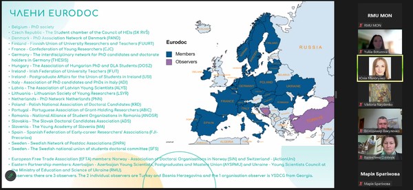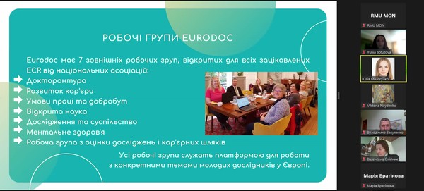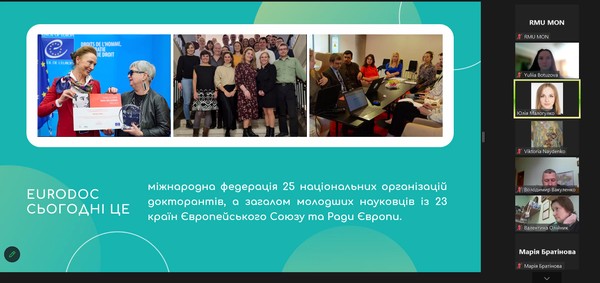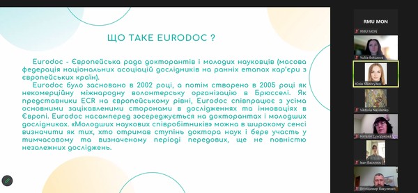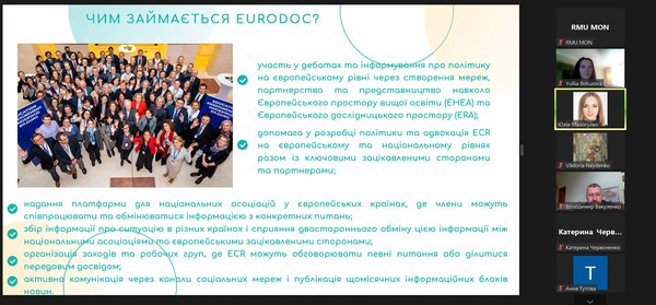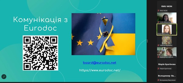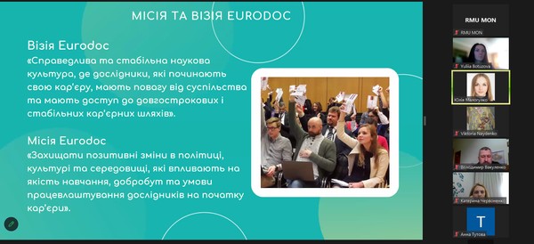 Спікер Юлія Малогулко детально розказала про організацію Eurodoc, її місію та візію, напрями діяльності, проєкти, робочі групи. Важливим аспектом доповіді було питання можливості комунікації та долучення до цієї міжнародної організації.
