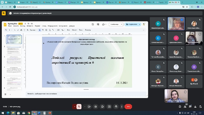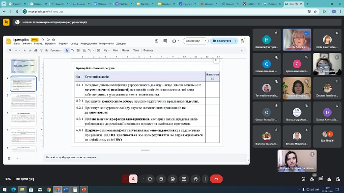 Оксана Петрівна підготувала кейс із прикладами опису підкритеріїв критерію 5 звіту самоаналізу та звернула увагу учасників семінару на позитивні практики чіткості і зрозумілості форм контрольних заходів та критеріїв оцінювання навчальних досягнень. Наталія Подопригора продемонструвала приклад відображення критеріїв оцінювання навчальних досягнень студентів на платформі Google Classroom.