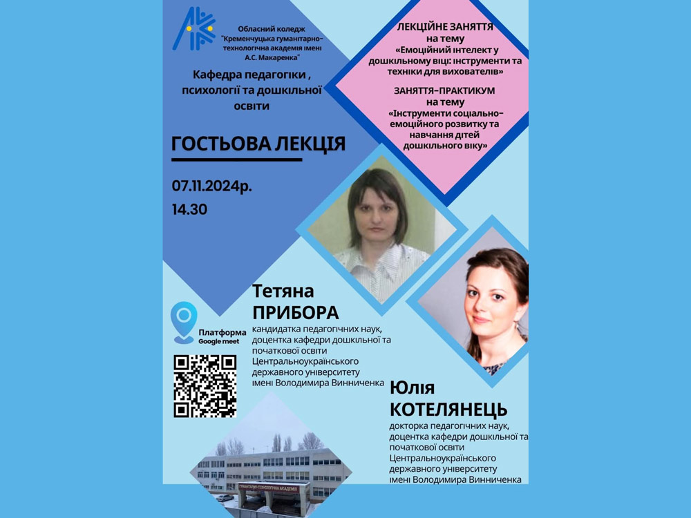 7 листопада 2024 року в межах активної міжінституційної співпраці між Центральноукраїнським державним університетом імені Володимира Винниченка та обласним коледжем «Кременчуцька гуманітарно-технологічна академія імені А. С. Макаренка» відбувся науково-практичний захід, присвячений проблемам емоційного розвитку дітей дошкільного віку.
