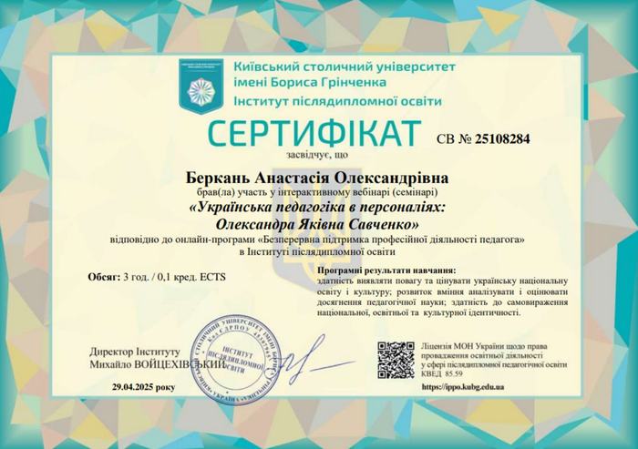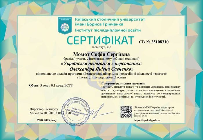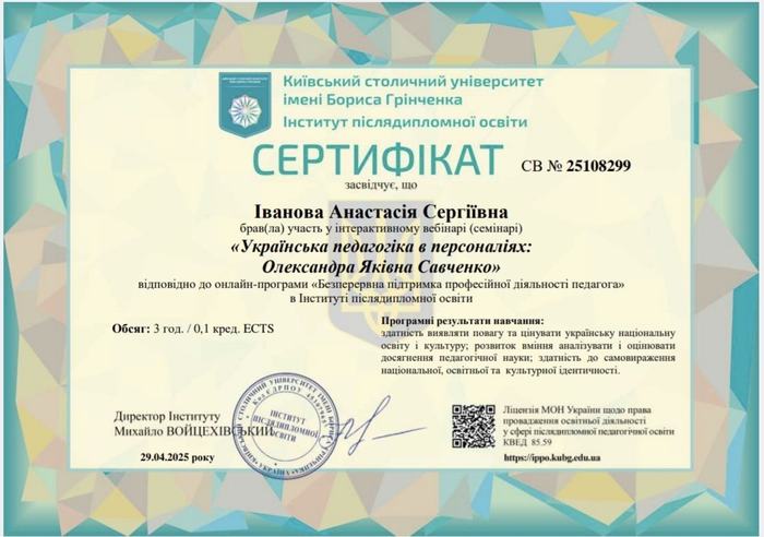 Для студентів участь у вебінарі стала не лише формою науково-педагогічного збагачення, а й морально-професійною подією: вони мали змогу відчути цінність педагогічної традиції, ознайомитися з історією становлення сучасної української школи, сформувати уявлення про справжню педагогічну відповідальність і наукову чесність, якими керувалася Олександра Яківна Савченко упродовж усього життя.