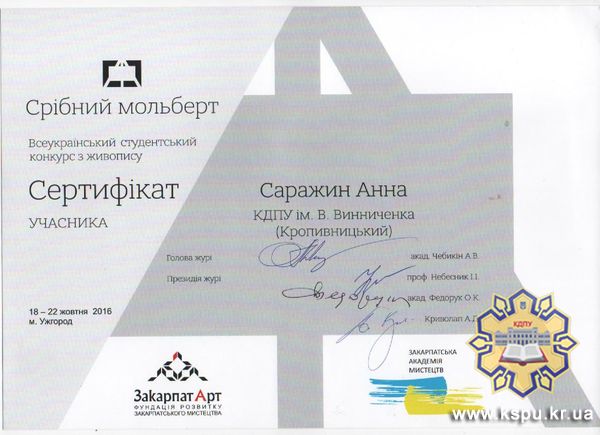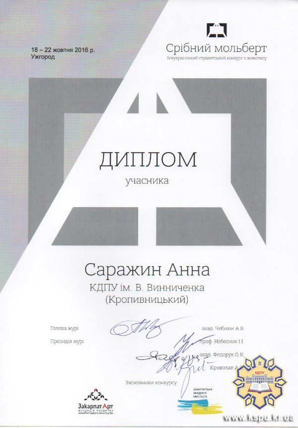 Студенти художньо-графічного відділення мистецького факультету Геращенко Богдан (V курс) та Саражин Анна (IV курс) взяли участь у Всеукраїнському студентському конкурсі з живопису «Срібний мольберт», який проводився з 18 по 22 жовтня 2016 року в місті Ужгороді.