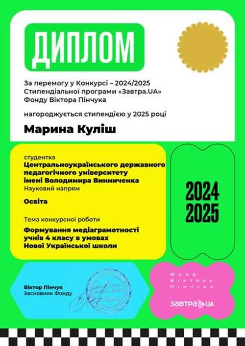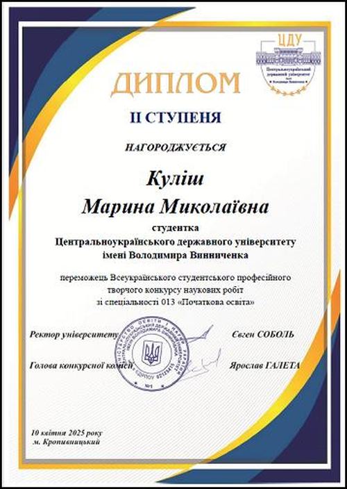Диплом ІІ ступеня на Всеукраїнському студентському професійному творчому конкурсі наукових робіт зі спеціальності “Початкова освіта»