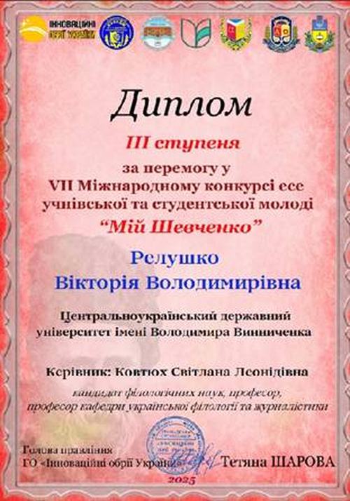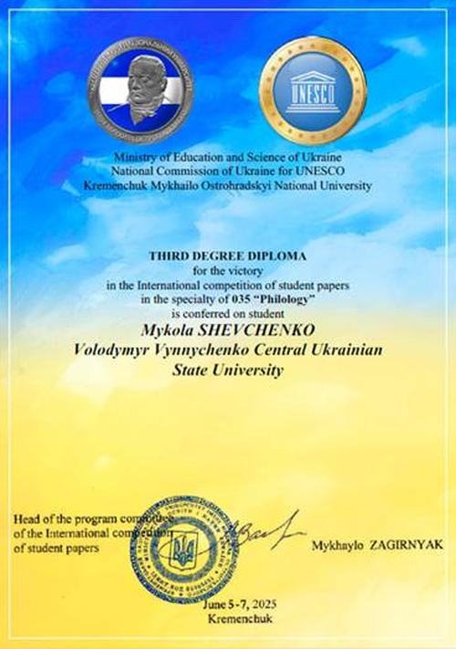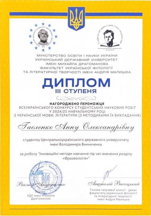 Диплом ІІІ ступеня на Всеукраїнському конкурсі студентських наукових робіт з української мови та літератури