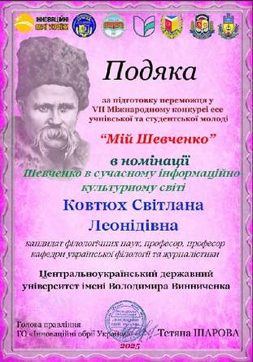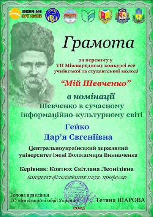 учнівської та студентської молоді “Мій Шевченко” в номінації “Шевченко в сучасному інформаційно-культурному світі ”