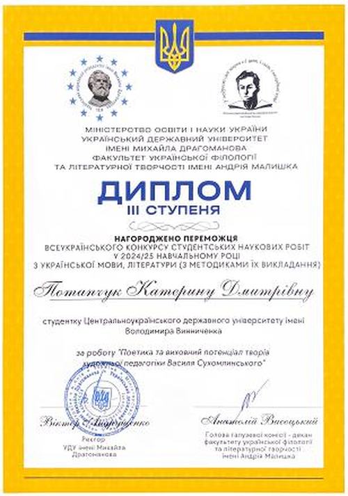 Диплом ІІІ ступеня на Всеукраїнському конкурсі студентських наукових робіт з української мови та літератури (секція українська література)