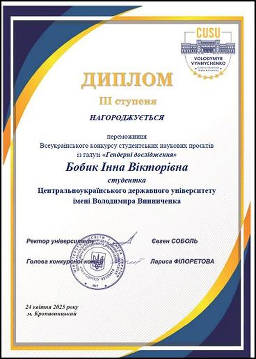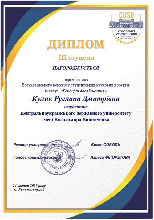 Диплом ІІІ ступеня на Всеукраїнському конкурсі студентських наукових проєктів із галузі “Гендерні дослідження”