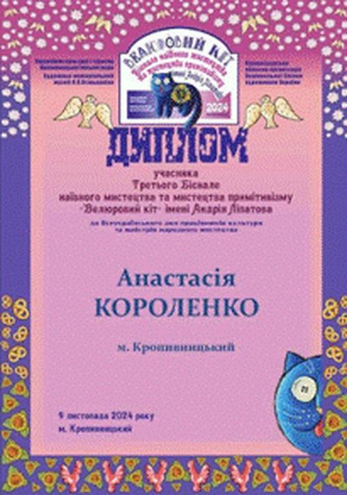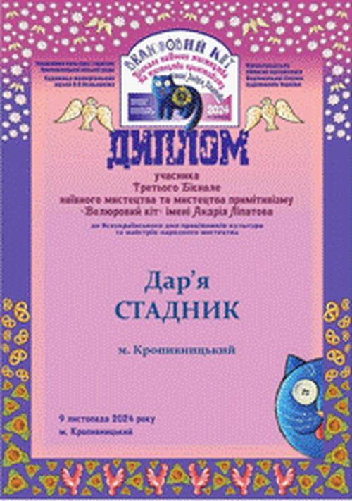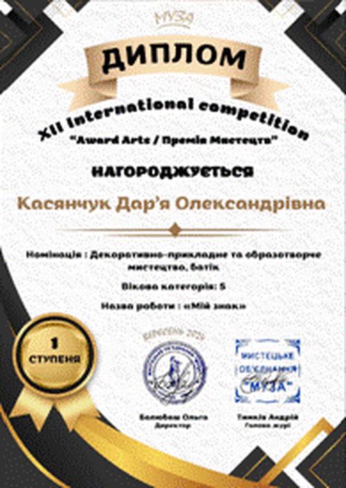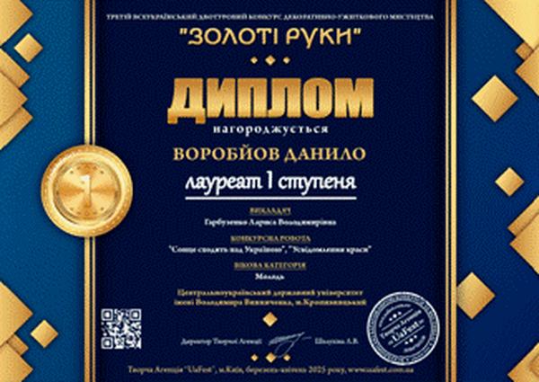 Лауреат І ступеня Третього Всеукраїнського двотурового конкурсу декоративно-прикладного мистецтва «Золоті руки»