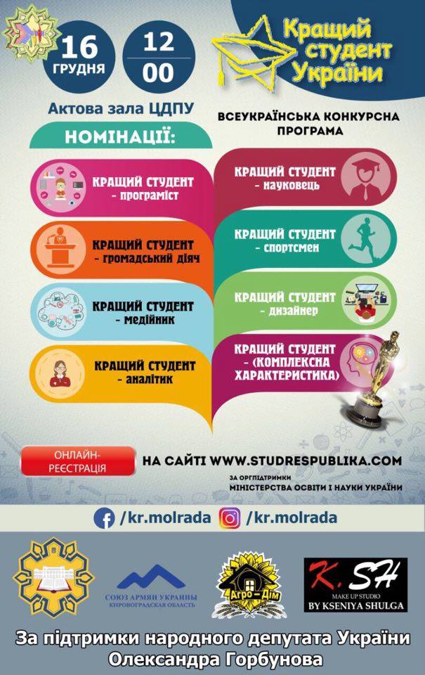 16 грудня в актовій залі Центральноукраїнського державного педагогічного університету імені В.Винниченка о 12 годині пройде регіональний етап Всеукраїнської конкурсної програми програми "Кращий студент України" за підтримки відділу сім'ї та молоді Міської ради міста Кропивницького.