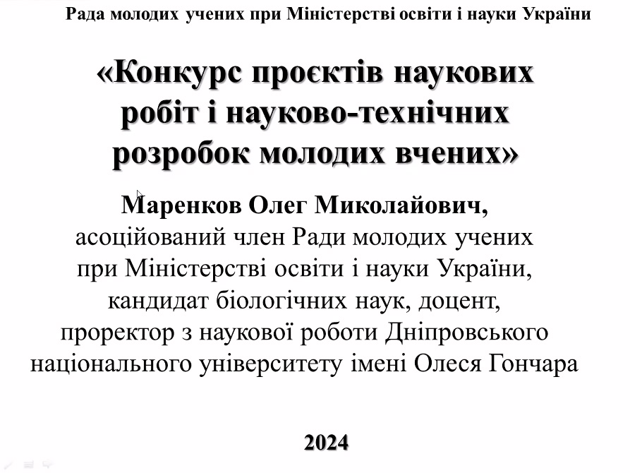 19 серпня 2024 року стартував Конкурс проєктів фундаментальних наукових досліджень, прикладних наукових досліджень та науково-технічних (експериментальних) розробок молодих учених (наказ МОНУ від 16.08.2024 №1160).