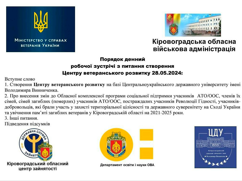 На базі Центральноукраїнського державного університету імені Володимира Винниченка планується створення Центру ветеранського розвитку. Про це повідомили на нараді за участі заступниці начальника Кіровоградської обласної військової адміністрації Катерини Колтунової, директорки Департаменту освіти і науки ОВА Ельзи Лещенко, ректора університету Євгена Соболя та представників громадськості.