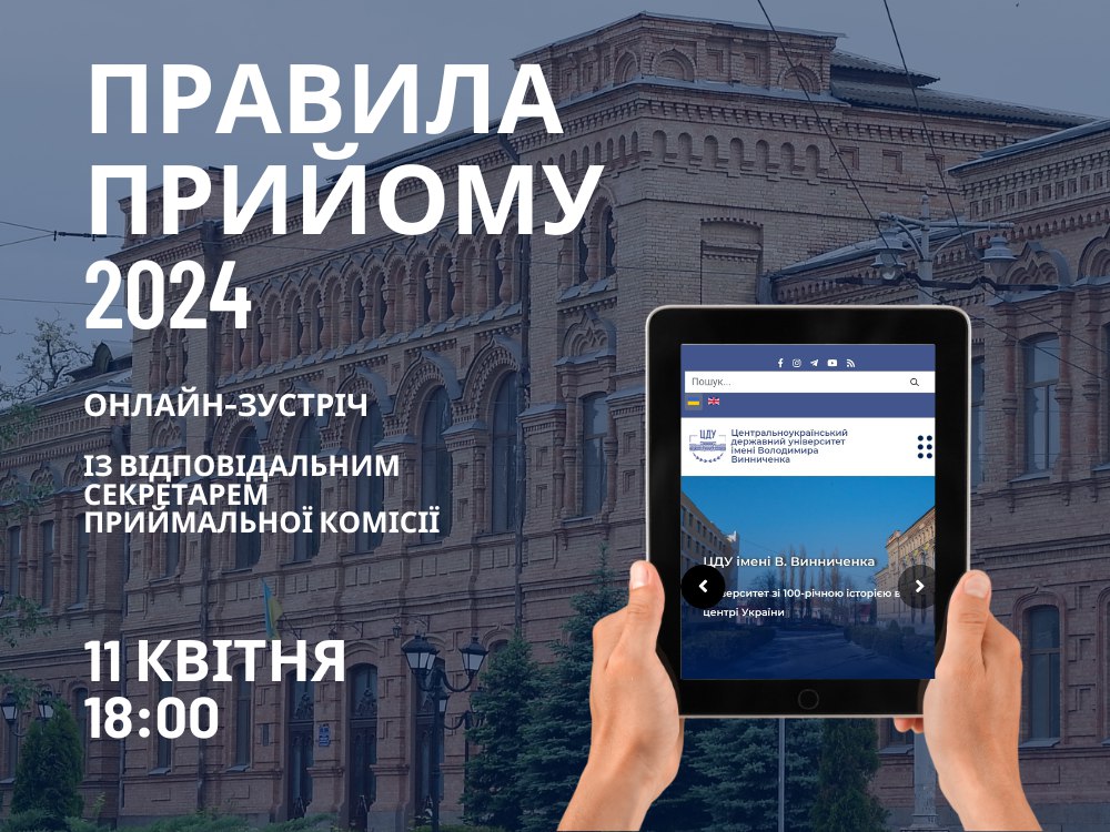 Центральноукраїнський державний університет імені Володимира Винниченка запрошує абітурієнтів на онлайн-зустріч з відповідальним секретарем Приймальної комісії. Під час заходу розглянемо такі питання про Вступ-2024: