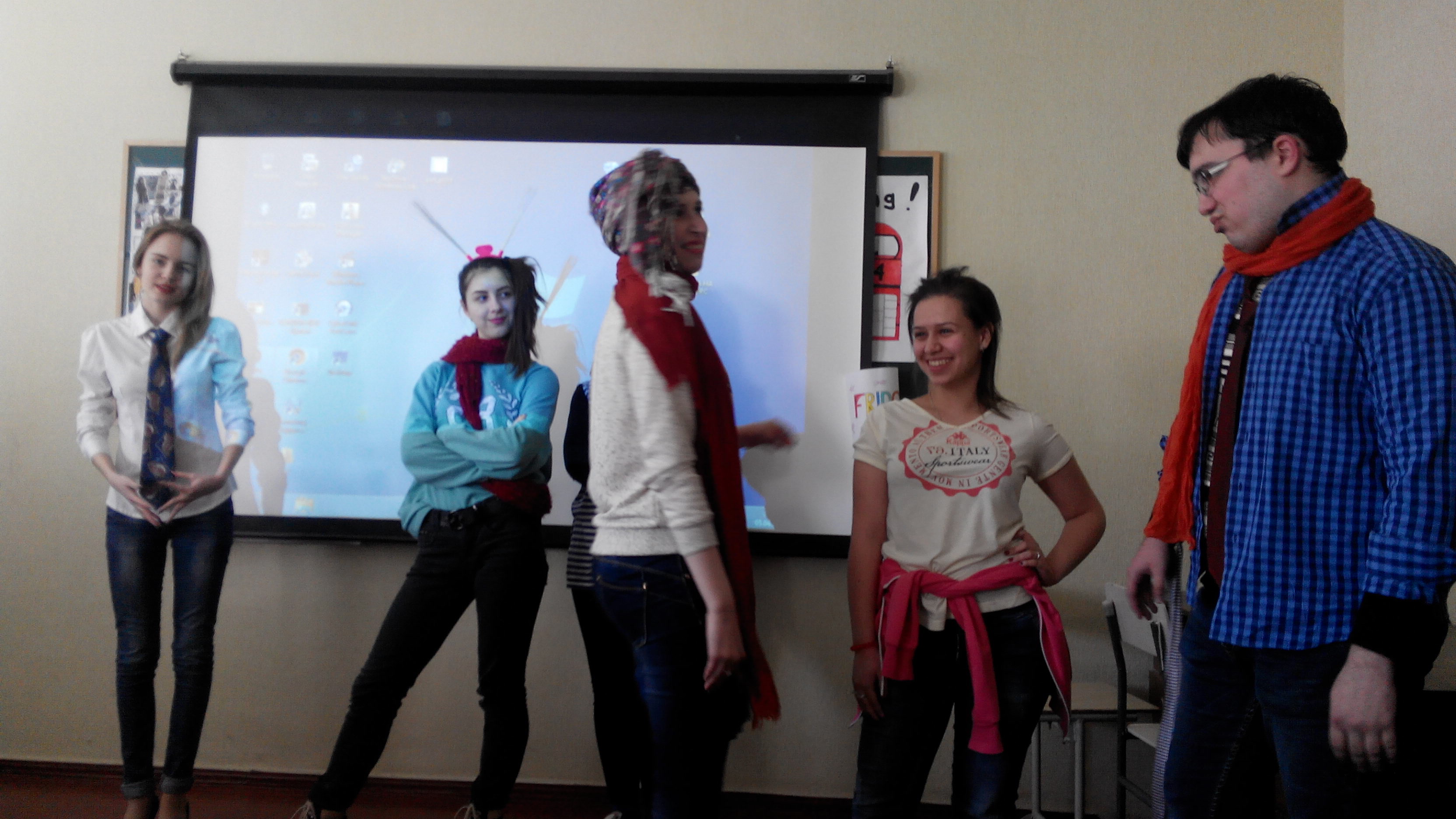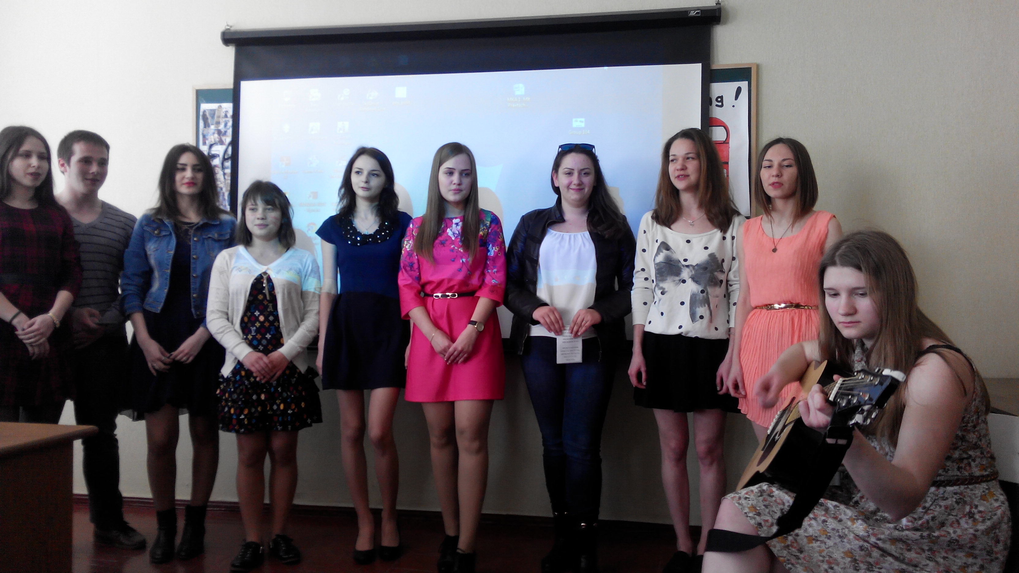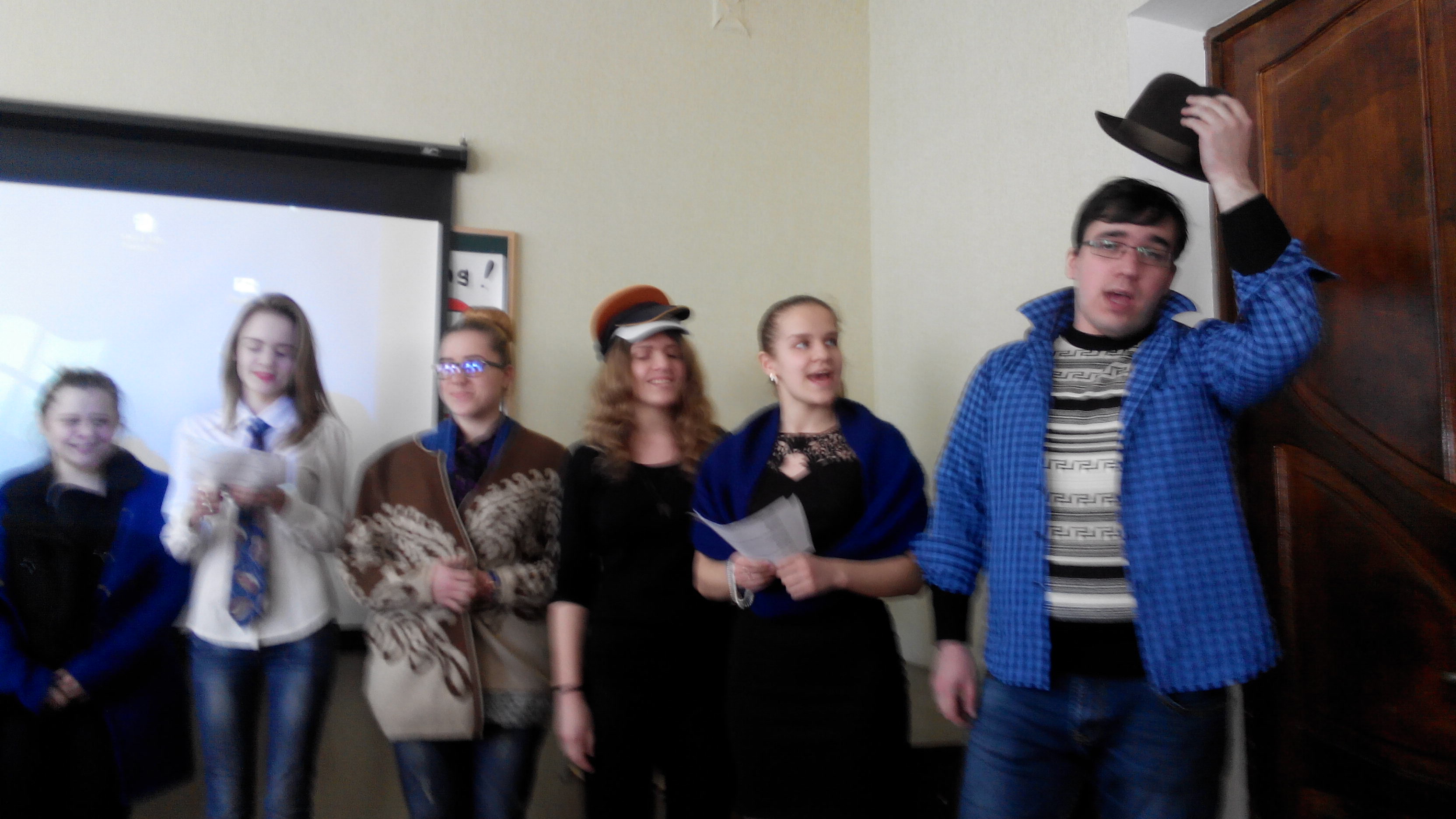 Secondly, all the groups had an opportunity to show their acting skills. They had to present their language skills using as much words of the topic they were given to deal with. Group 101 showed a fashionable TV-show called “Fashion is my profession”. Their acting was full of funny moments, so the audience couldn’t resist laughing. Group 102 showed a beautiful version of the Disney fairytale. It was a play, where many princesses taught the Donkey how to deal with household duties. After this informative acting Group 103 performed a quarrel between a husband and a wife. It was very funny. Next Group 104 showed us some difficulties of being a student at the Faculty of Foreign Languages. This performance was very true to life, so all the presents were laughing at different students situations like a first lection, doing homework, students holidays. And Group 105 impressed the audience by a play in German. It sounded very native.