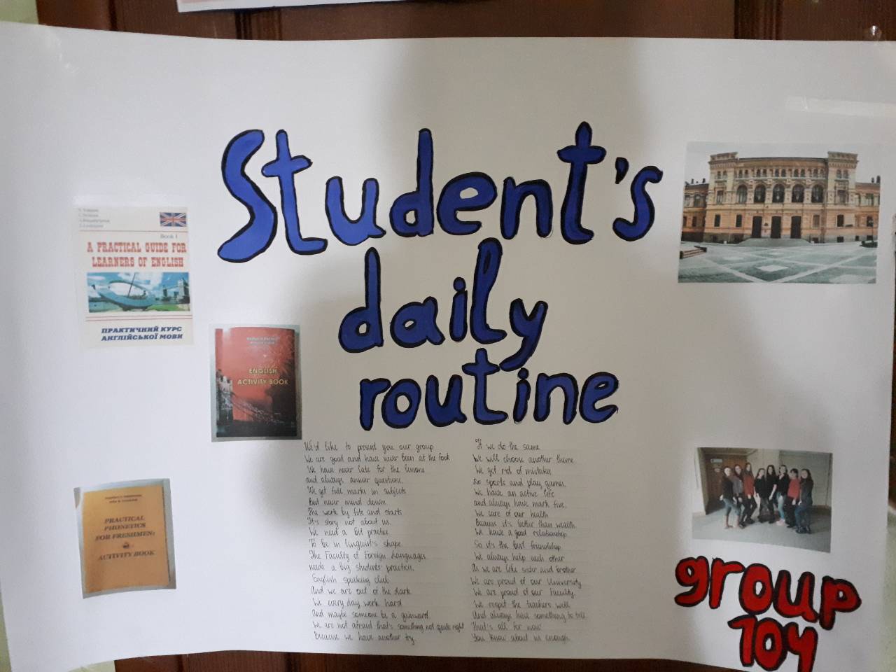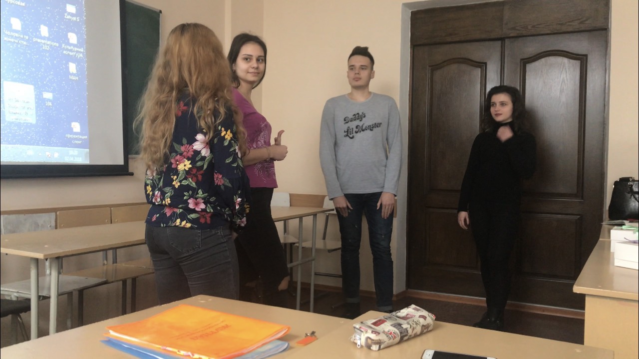 Цього понеділка на другій парі відбулося курйозне змагання серед майбутніх вчителів англійської мови. Конкурс складався з декількох етапів: плакат на тему, обрану при жеребкуванні, презентація групи, пісня та сама комічна сценка. Усе, звичайно ж, англійською мовою з використангям вивченого вокабуляру.
