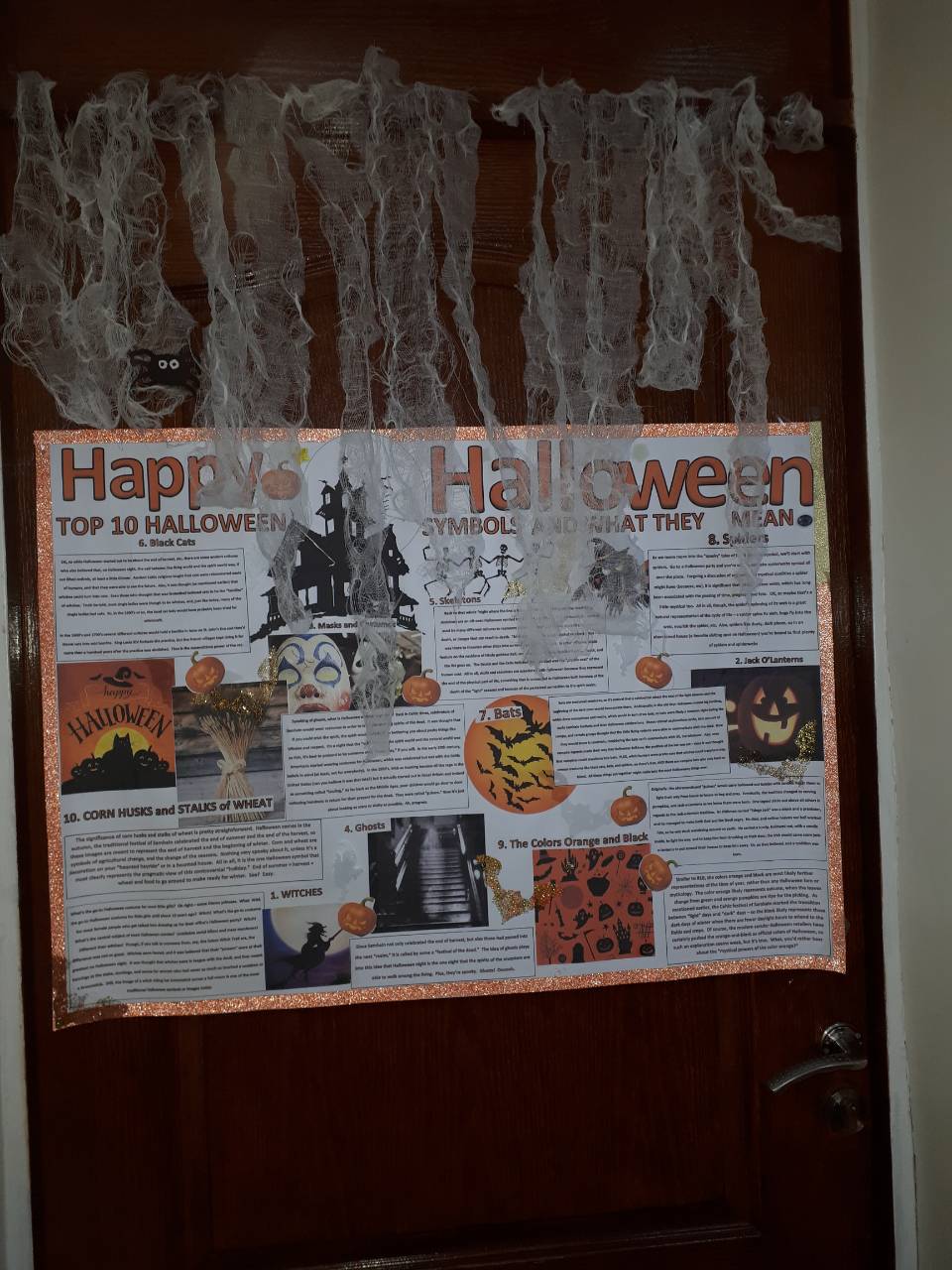 Спочатку з доповіддю про історію Halloween виступив студент групи Клименко Антон. Після доповіді Антон продемонстрував відео про історію цього свята. Після цього виступила студентка Полтавець Катерина, яка розповіла цікаві факти щодо Halloween. Наступною виступила Азза Катерина, яка також розповіла цікаві факти про це свято. Після виступу Катерина показала відео під назвою «Bet You Didn't Know». В свою чергу, староста групи Бойко Аліна розповіла про те, як святкують Halloween в різних країнах. Катерина Головіна підготувала плакат та доповідь про 10 символів Halloween. Після Катерини виступив Тимофій Вашека, який підготував презентацію під назвою «What is Halloween and can our country celebrate it?». На цьому теоретична частина була завершена.