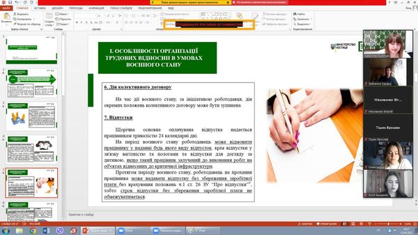 15 вересня 2022 року здобувачі освітньої програми «Право», студенти-консультанти юридичної клініки «Artium de Lex» відвідали онлайн-захід «Особливості організації трудових відносин в умовах воєнного стану», який проводив Регіональний центр з надання безоплатної вторинної правової допомоги у Кіровоградській та Миколаївській областях.