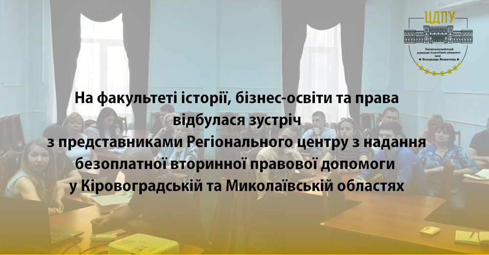8 серпня 2022 року відбулась зустріч здобувачів освітніх програм «Право», «Правоохоронна діяльність», «Середня освіта (Історія, Правознавство)», викладачів кафедри права та правоохоронної діяльності факультету історії, бізнес-освіти та права з представниками Регіонального центру з надання БВПД у Кіровоградській та Миколаївській областях. Захід був присвячений ВІДНОВНОМУ ПРАВОСУДДЮ як новому підходу до реагування на кримінальні правопорушення, скоєні неповнолітніми.